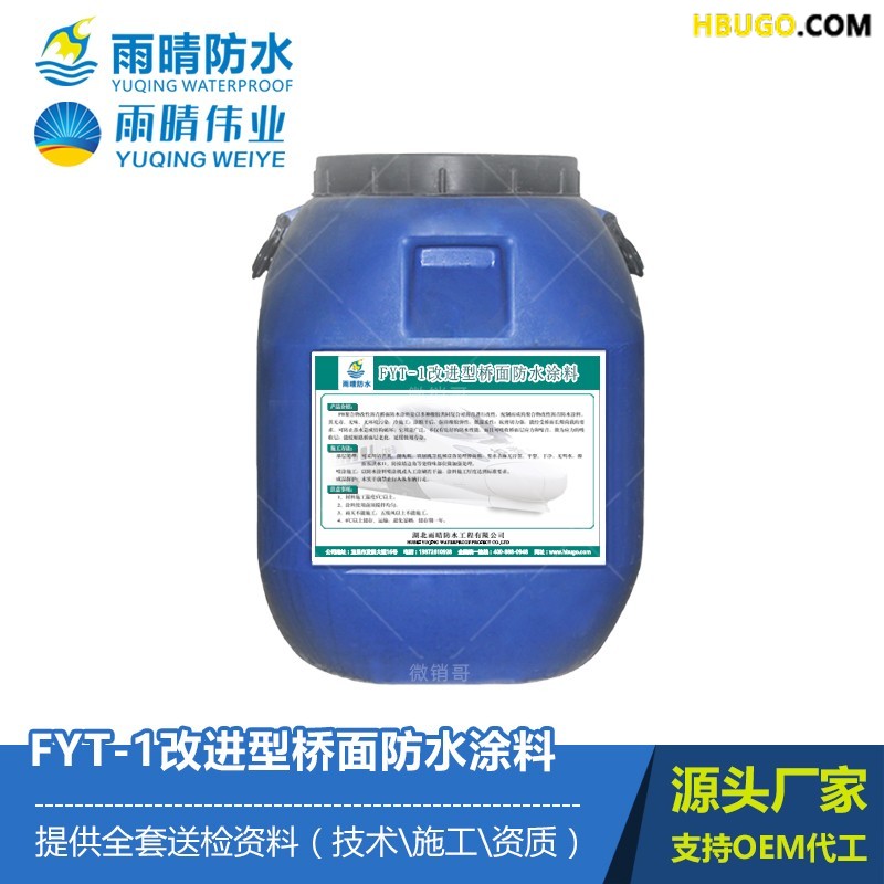 FYT-1改进型桥面防水涂料(HC-201),是一种高分子复合材料,属我国重点科技推广项目,经我国多方部门专家鉴定,达到同类产品水平。产品经交通部公路工程检测中心测试,全部技术指标均符合JT/T575-2005标准要求;符合JTT041-2000(公路桥涵施工技术规范),采用特种国产沥青或进口或国内石油沥青为主要原料,配以各种表面活性剂及多种化学助剂、SBS热塑性橡胶为辅助原料,在掺加大剂量的高分子聚合物树脂进行改性,生产的一种新型复合防水涂料.